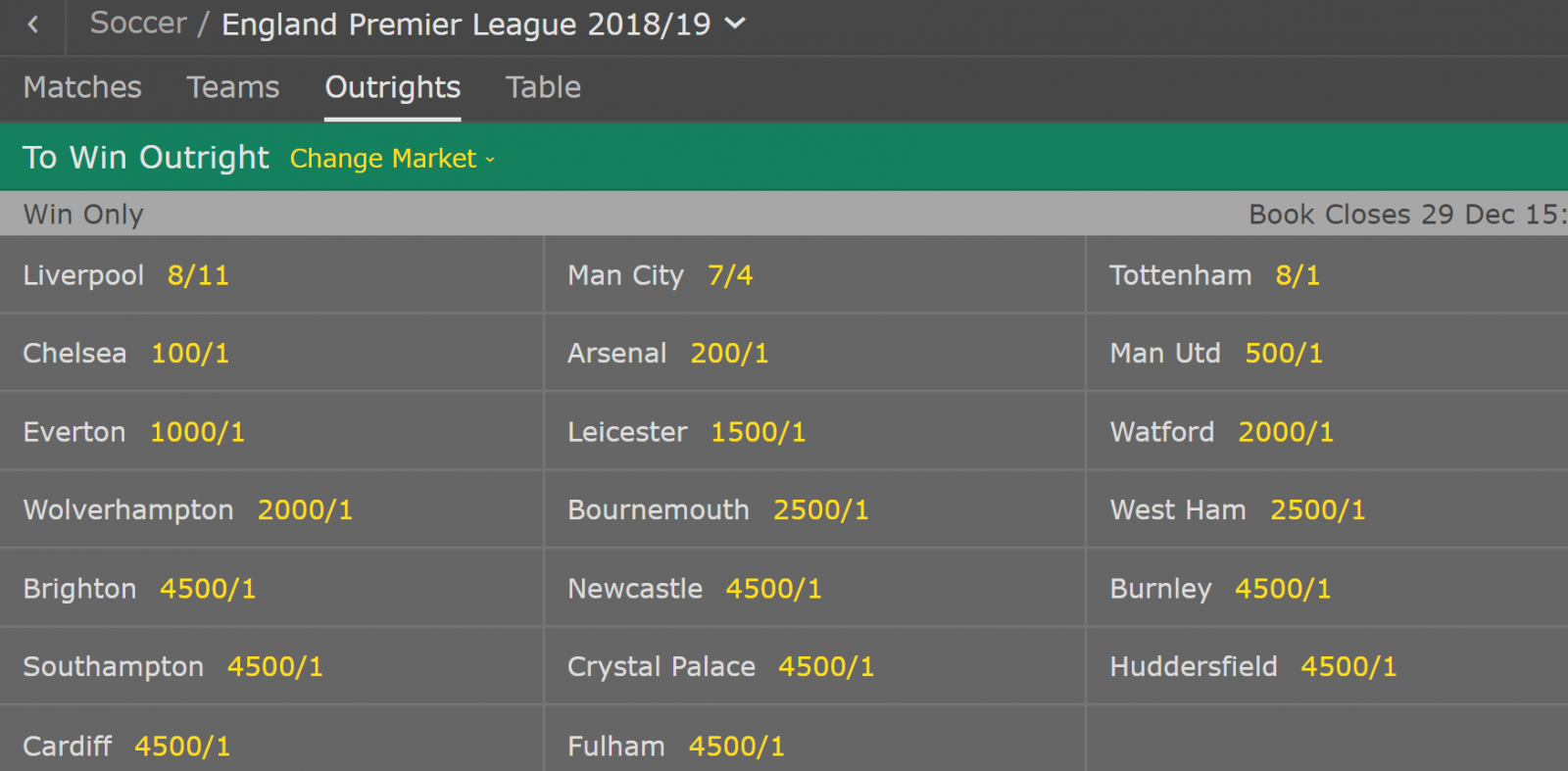 以英国机构日博为例,利物浦的夺冠赔率降至11赔8(约1.72),反超曼城来到榜首;而落后红军7分的曼城夺冠赔率则升至4赔7(2.75),位列第2;落后利物浦6分夺得半程亚军的热刺夺冠赔率从上一轮前的1赔16降至1赔8,他们仍存在不算太小的夺冠可能。排名分列4-6位的切尔西、阿森纳和曼联的夺冠赔率分别为1赔100,1赔200和1赔500。