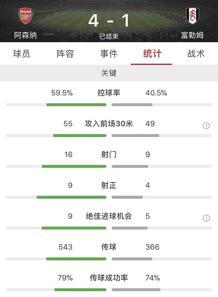 数据方面阿森纳占据优势,不仅控球率接近6成,多达16脚的射门也是远高于富勒姆的9脚,其中9脚射正。