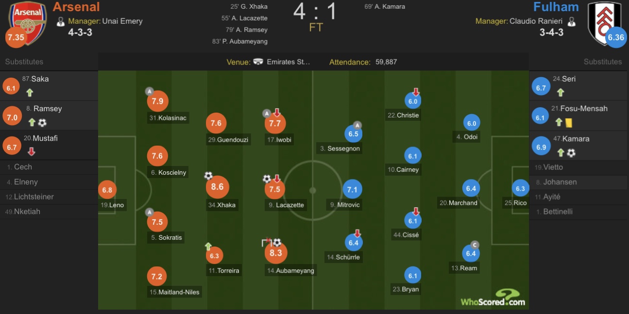 为阿森纳率先破门的扎卡收获本场比赛最高评分,打入锁定胜局一球的奥巴梅扬紧随其后,富勒姆方面则是米特罗维奇收获队内最高评分。