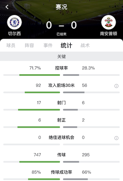 最终比赛结束,切尔西0-0南安普顿。