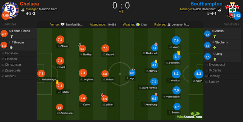 赛后评分方面,南安普顿门神刚恩获得最高的8.3分;切尔西方面则是由若日尼奥获得7.8的队内最高分。