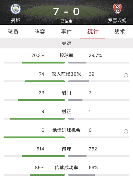 最终全场比赛结束,曼城主场7-0战胜罗瑟汉姆。