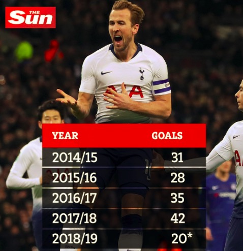 2014/15赛季,凯恩打进31球;2015/16赛季,凯恩打进28球;2016/17赛季,凯恩打进35球,2017/18赛季,凯恩打进42球。