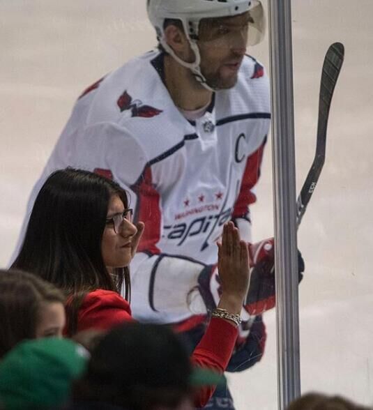 同时,卡莉法还是一个冰球粉丝,下图是她和华盛顿首都人队“奥八爷”奥维契金的同框。