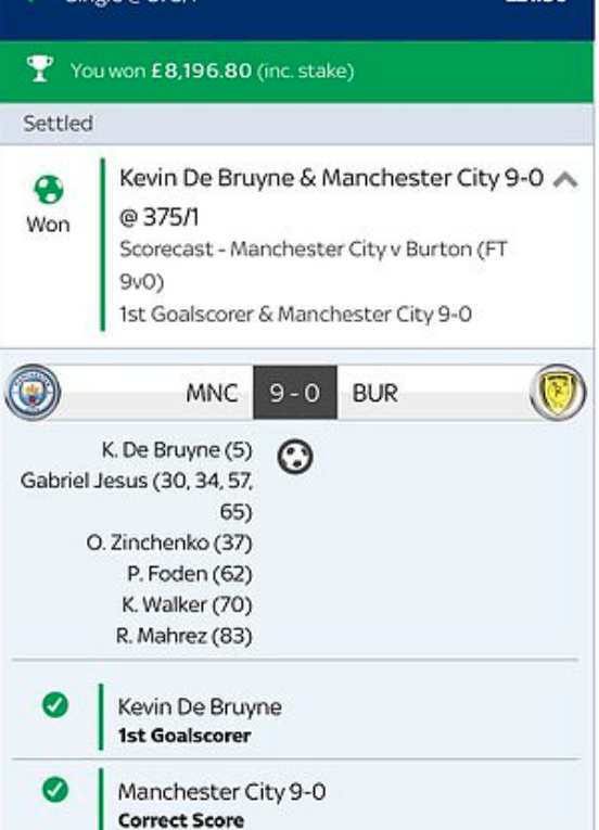 大赢家1月11日讯 即便曼城现在是英格兰最好的球队之一,即便伯顿与蓝月亮差距甚大,也很少有人会预测在周三的比赛中会打出9-0的比分。不过一位曼城的支持者却不这样想,他准确地猜中了最终的结果和第一个进球人,这让他21.8英镑的投注得到了8196镑(1赔376)的收获。