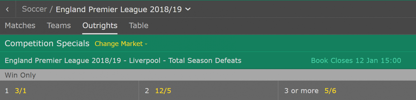 大赢家1月12日讯 在上轮利物浦不敌曼城之后,英国机构日博关闭了利物浦英超赛季不败的投注项目,取而代之的是利物浦队英超输球总场次的项目。