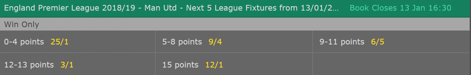 日前,英国机构日博就曼联在这5轮联赛中收获的总积分开出赔率:0-4分的赔率为1赔25;5-8分的赔率为4赔9(3.25);9-11分的赔率最低,为5赔6(2.2);12-13分(五战四胜)的赔率为1赔3;15分(五战全胜)的赔率则为1赔12。