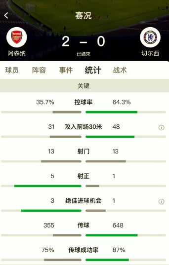 输给阿森纳的比赛中,切尔西虽在控球率和攻入前插30米次数上占据优势,但并没有取得想要的结果。阿森纳门将莱诺直到比赛第81分钟才做出了他全场第一次也是唯一一次扑救。这是萨里执教的切尔西射正数最少的一场英超比赛。