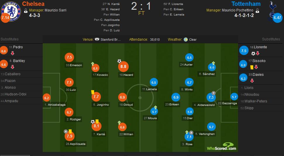 阿扎尔破门获得全场最高的8.8分,坎特远射首开纪录获得8.1分;热刺方面,略伦特破门获得全队最高的7.5分。