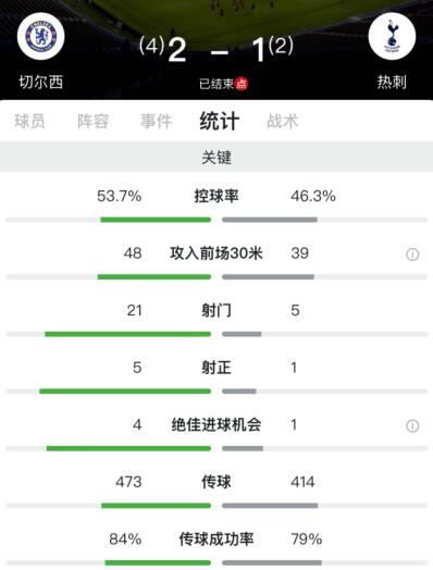 切尔西占据优势,全场控球率53.7%,热刺控球率46.3%,切尔西全场21次射门5脚射正获得4次绝佳进球机会取得2粒进球,热刺全场5次射门1脚射正获得1次绝佳进球机会取得1粒进球。