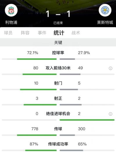 利物浦占据控球优势,全场控球率72.1%,莱斯特城控球率27.9%,利物浦全场10次射门3脚射正取得1粒进球,莱斯特城全场5次射门2脚射正获得2次绝佳进球机会取得1粒进球。