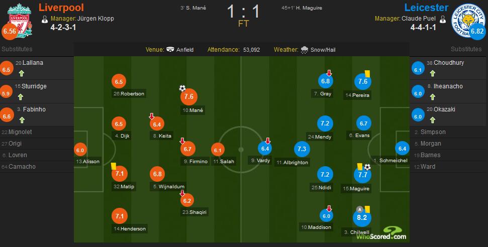 马奎尔破门帮助莱斯特城客场取分获得全场最高的7.7分;马内闪电破门获得全队最高的7.6分。