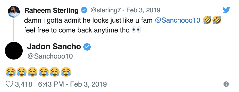 斯特林在推特上写道:“我去,我得说这人长得就像哥们你啊桑乔,随时回来哦兄弟。”桑乔则在推特上回了若干“笑哭”的表情。