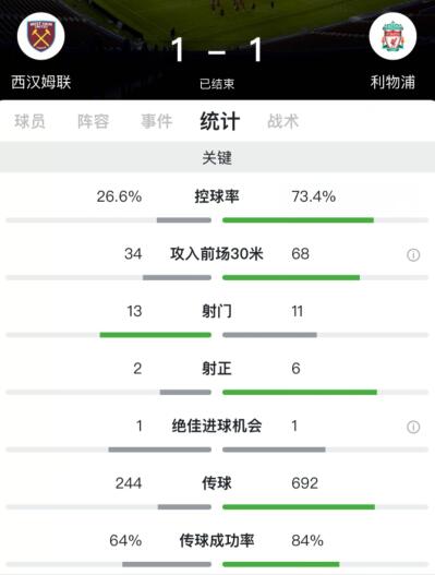 利物浦占据控球优势,全场控球率73.4%,西汉姆联控球率26.6%,利物浦全场11次射门6脚射正获得1次绝佳进球机会取得1粒进球,西汉姆联全场13次射门2脚射正获得1次绝佳进球机会取得1粒进球。