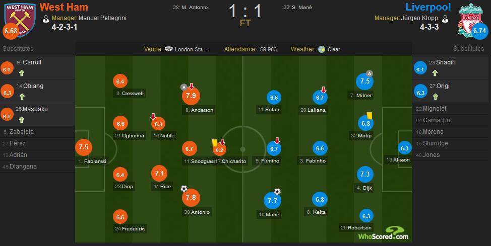 安德森任意球送助攻获得全场最高的7.9分,安东尼奥破门救主获得7.8分;利物浦方面,马内破门获得全队最高的7.7分,米尔纳送出助攻获得7.5分。