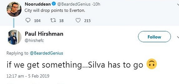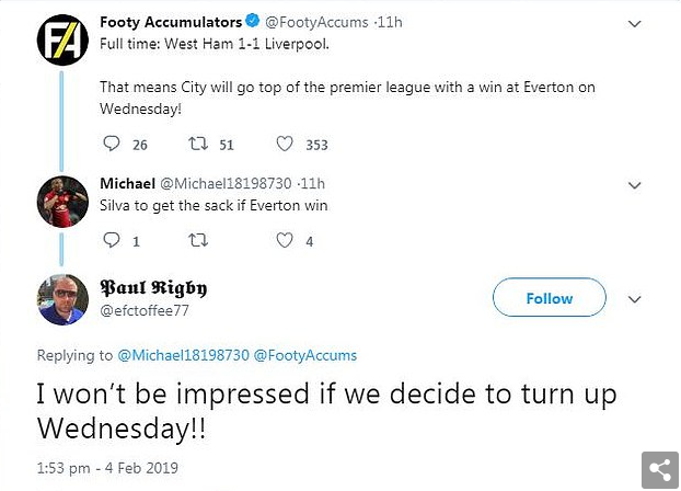 周一晚上,利物浦在西汉姆的主场丢分后,一位推特用户表示曼城也可能会在埃弗顿的球场丢分。这促使埃弗顿球迷做出了这样的回应。一位埃弗顿球迷表示:“如果我们有什么意外,那么席尔瓦可以离开了。”