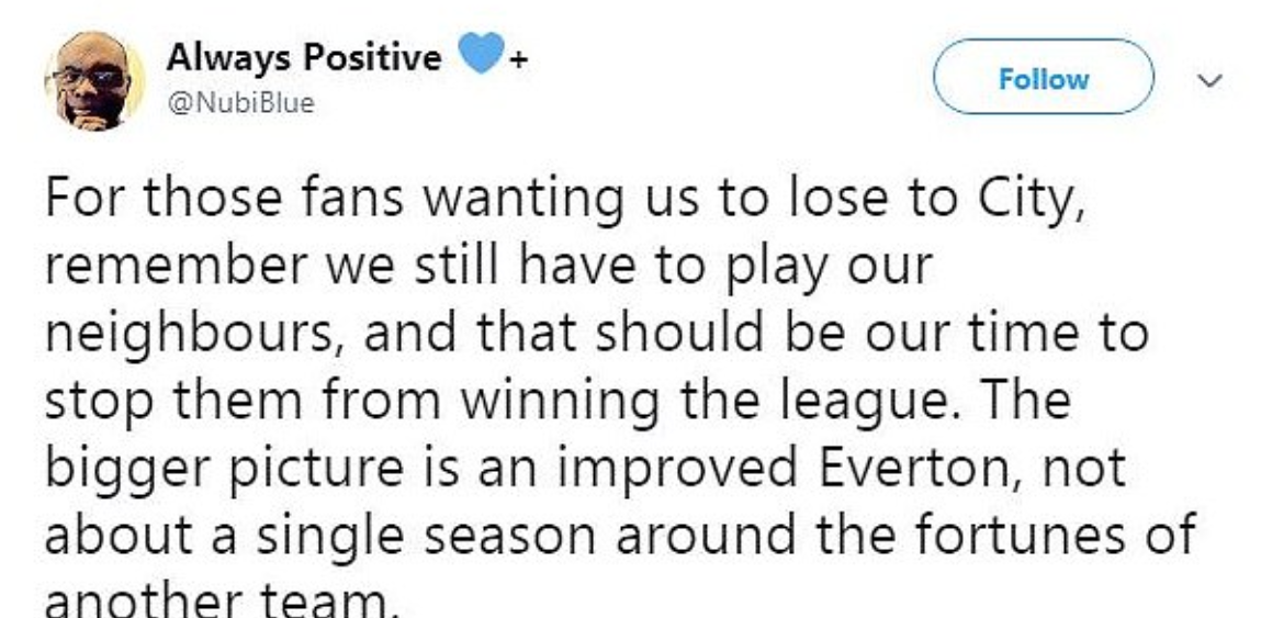 然而,不是所有的埃弗顿球迷都希望球队输球。其中,一位叫NubiBlue的用户呼吁埃弗顿赢得比赛,我们希望3月3日的默西塞德德比中击败对手以粉碎利物浦的冠军希望。