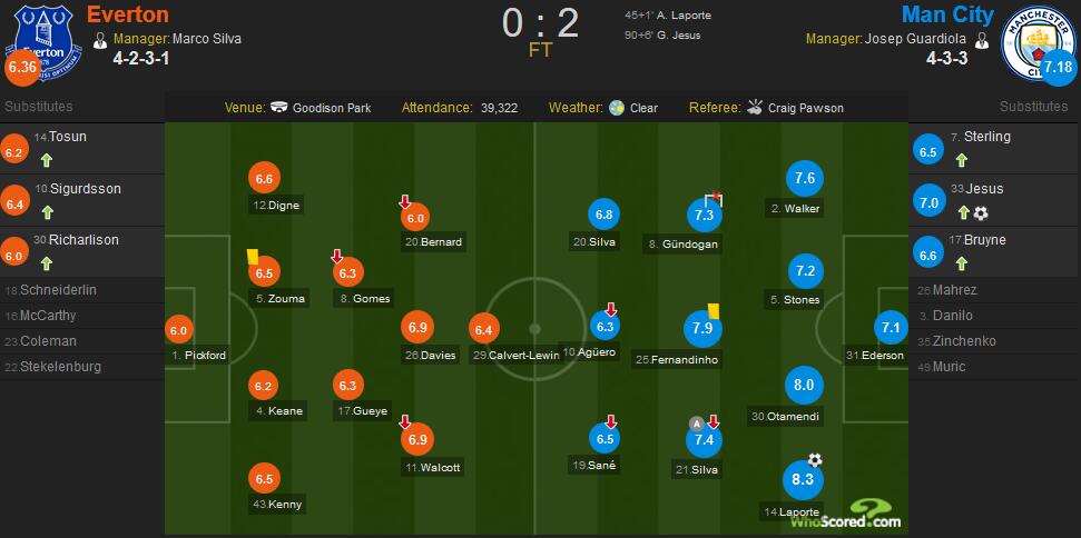 最终,曼城客场2-0埃弗顿。