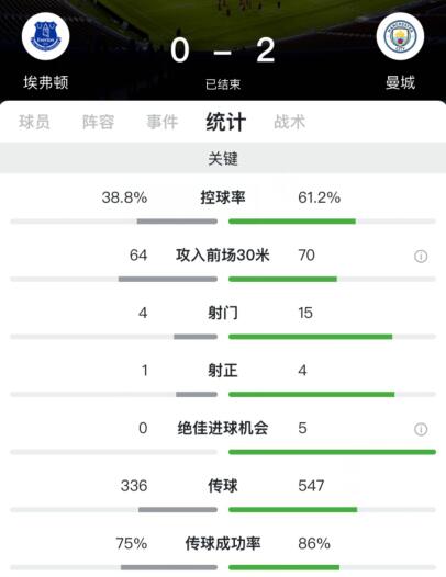 曼城占据控球优势,全场控球率61.2%,埃弗顿控球率38.8%,曼城全场15次射门4脚射正获得5次绝佳进球机会取得2粒进球,埃弗顿全场4次射门1脚射正未能进球。