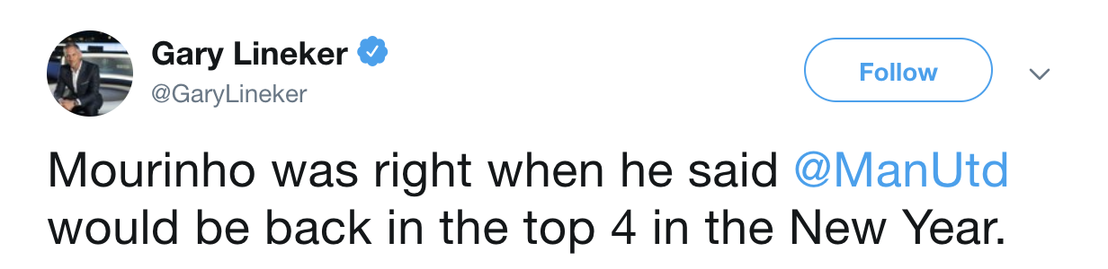 大赢家2月10日讯 在3-0战胜富勒姆的比赛后,曼联以51分力压切尔西和阿森纳,进入了前四。莱因克尔在推特上写道:“穆里尼奥说的对啊,当时他说曼联新年时就能回到前四。”