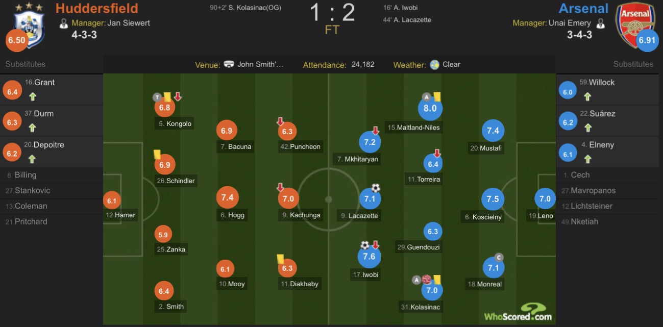大赢家2月10日讯 北京时间2月9日晚23:00,英超联赛第26轮,哈德斯菲尔德主场迎战阿森纳。上半场比赛科拉希纳茨助攻伊沃比凌空抽射率先破门,拉卡泽特进球扩大比分。下半场比赛伊沃比错失单刀,补时阶段科拉希纳茨自摆乌龙,最终全场比赛结束,阿森纳客场2-1战胜哈镇。目前阿森纳以15胜5平6负积50分的成绩位列第6,因净胜球劣势排在同分且少赛一场的切尔西身后,领先身后的狼队12分。