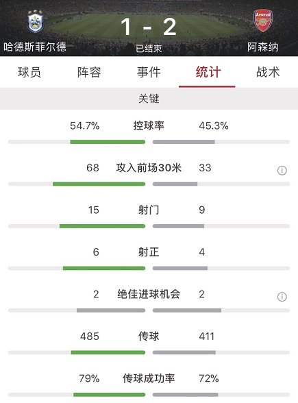 数据方面哈镇占据优势,控球率两队旗鼓相当,哈镇多达15脚的射门数远高于阿森纳的9脚,其中6脚射正。