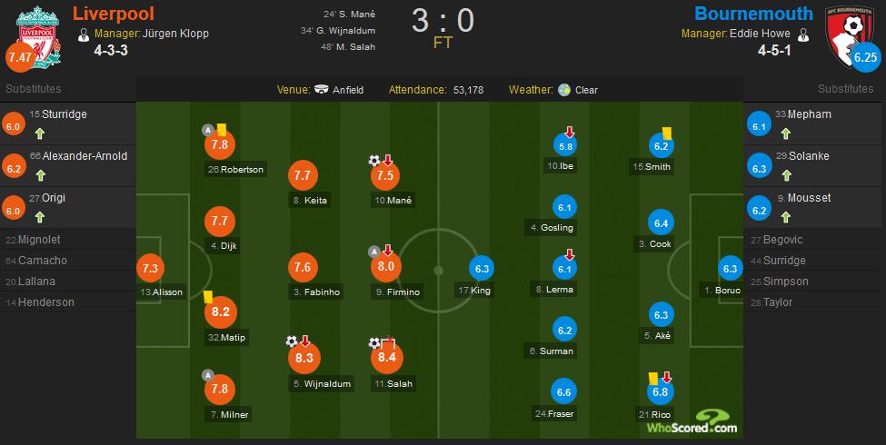 最终,利物浦主场3-0战胜伯恩茅斯。