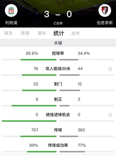 利物浦占据控球优势,全场控球率65.6%,伯恩茅斯控球率34.4%,利物浦全场20次射门9脚射正获得5次绝佳进球机会取得3粒进球,伯恩茅斯全场12次射门2脚射正未能进球。