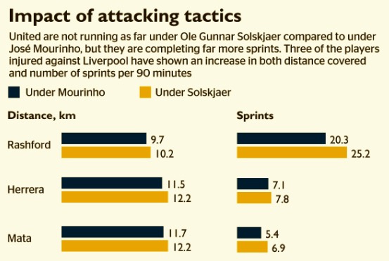 本赛季穆氏曼联的17场比赛场均冲刺98.6次,索帅执教下这个数字上升到了108.6次。