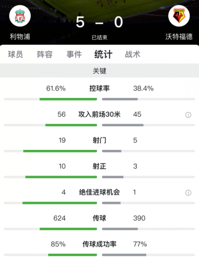 利物浦占据优势,全场控球率61.6%,沃特福德控球率38.4%,利物浦全场19次射门10脚射正获得4次绝佳进球机会取得5粒进球,沃特福德全场5次射门3脚射正获得1次绝佳进球机会未能进球。
