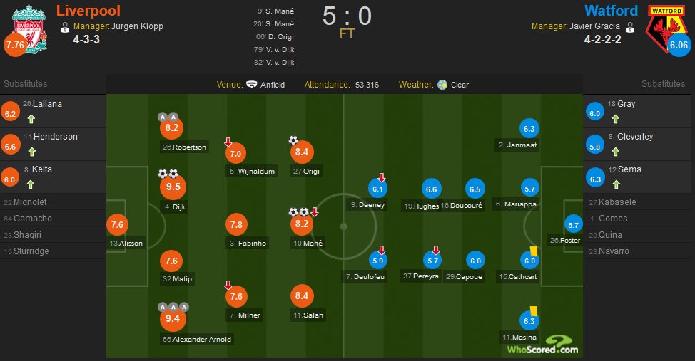 范戴克梅开二度获得全场最高的9.5分,亚历山大-阿诺德助攻帽子戏法获得9.4分,马内头顶脚踢梅开二度获得8.4分,罗伯逊助攻梅开二度获得8.2分;沃特福德方面,威尔-休斯获得全队最高的6.6分。