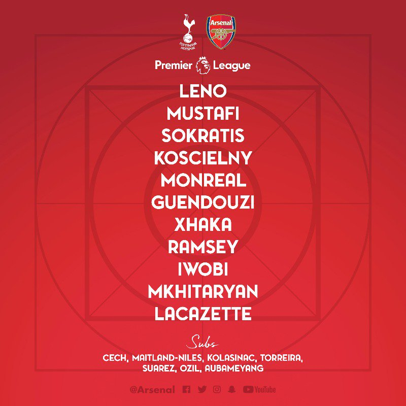 替补:梅特兰-奈尔斯、托雷拉、切赫、厄齐尔、科拉希纳茨、丹尼斯-苏亚雷斯、奥巴梅扬