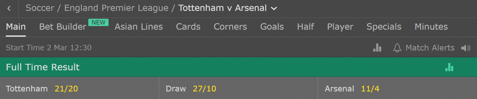 以英国公司日博给出的赔率为例,热刺主场取胜的赔率为20赔21(2.05),而两队打平和阿森纳赢球的赔率分别为10赔27(3.7)和4赔11(3.75)。