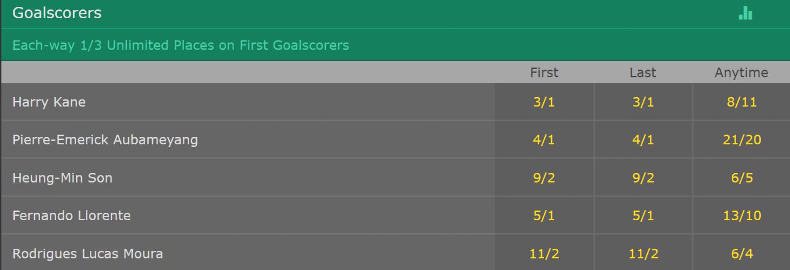 而在进球赔率方面,前五名中除位列第二的奥巴梅扬外均为热刺球员,分别是凯恩、孙兴慜、略伦特和卢卡斯。