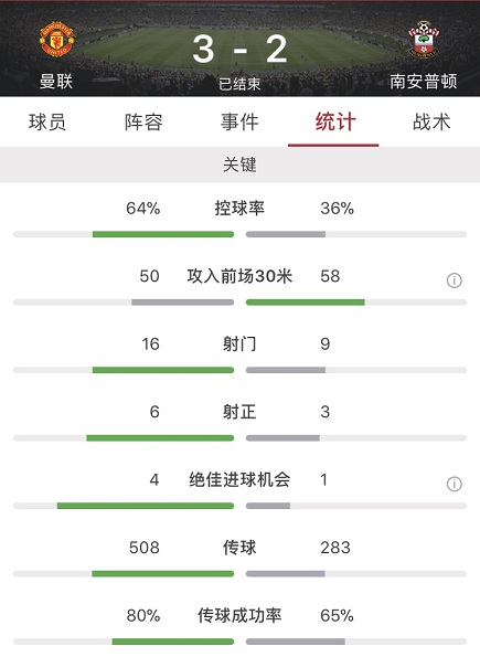 数据方面曼联全场占优,不仅控球率达到6成,多达16脚的射门数也是高于南安普顿的9脚,其中6脚射正。