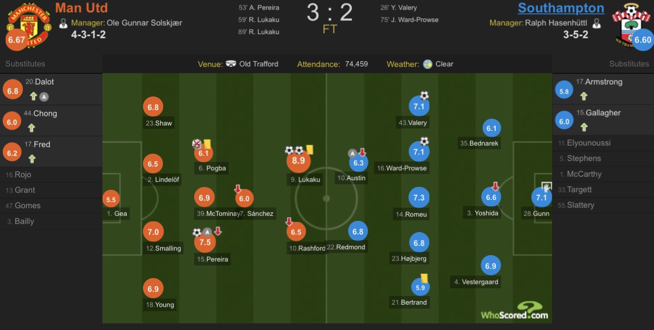 最终全场比赛结束,曼联主场3-2战胜南安普顿。