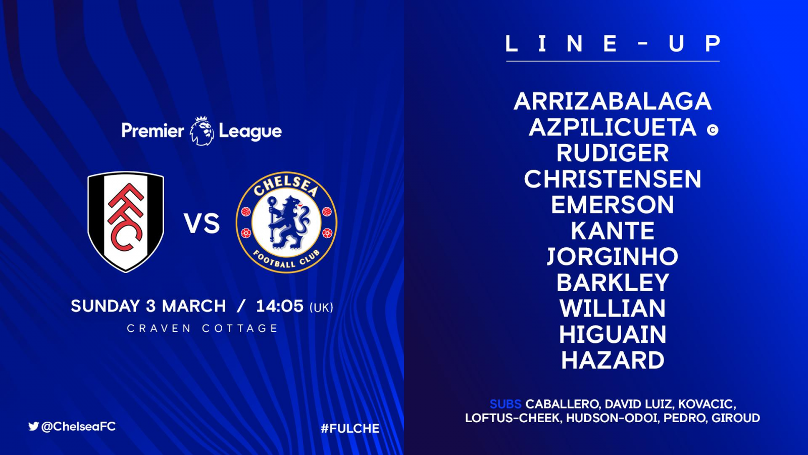 替补:哈德森-奥多伊、佩德罗、洛夫图斯-奇克、大卫-路易斯、科瓦契奇、吉鲁、卡瓦列罗