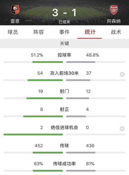 数据方面两队控球率旗鼓相当,雷恩19脚的射门数高于阿森纳的12脚,其中8脚射正。