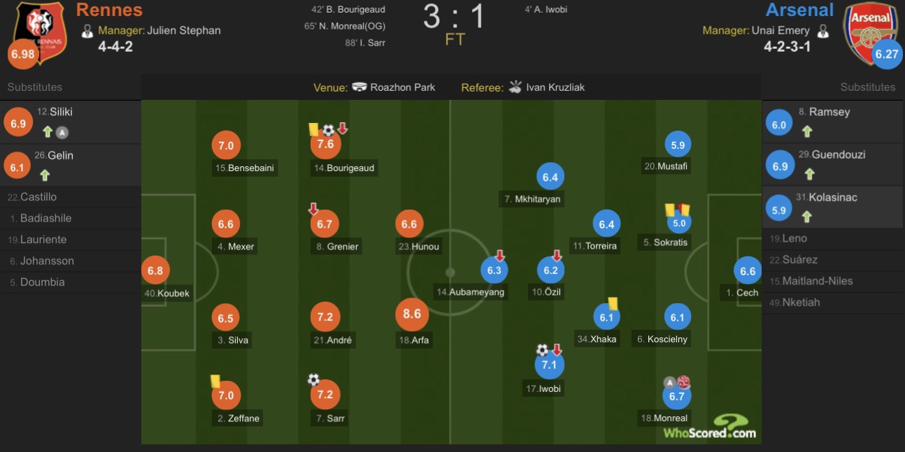 最终全场比赛结束,阿森纳客场1-3不敌雷恩。