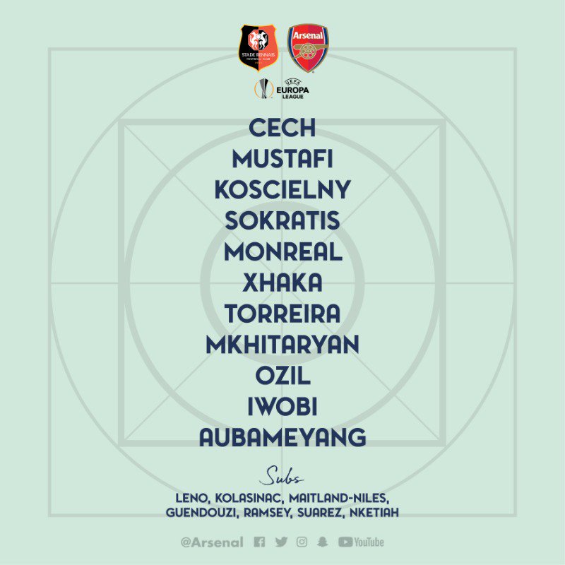 阿森纳首发(4231):切赫;穆斯塔菲、科斯切尔尼、帕帕斯塔索普洛斯、蒙雷亚尔;扎卡、托雷拉;姆希塔良、厄齐尔、伊沃比;奥巴梅扬