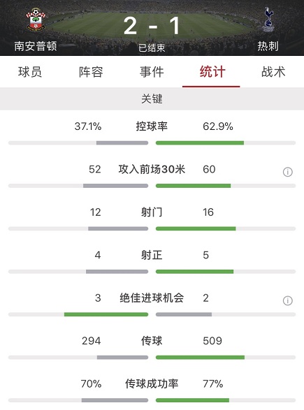 数据方面客场作战的热刺占据优势,不仅控球率达到6成,16脚的射门数也是高于南安普顿的12脚,其中5脚射正,不过比赛最终还是被门前把握机会能力更强的南安普顿赢下。