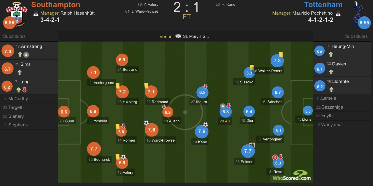 击中一次门框的埃里克森和南安普顿的贝德纳雷克共同收获本场比赛最高评分,打入一球的凯恩评分紧随其后。