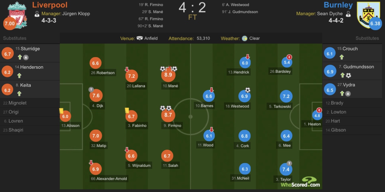 梅开二度且打中一次门框的马内收获本场比赛最高评分,同样梅开二度的菲尔米诺评分紧随其后。
