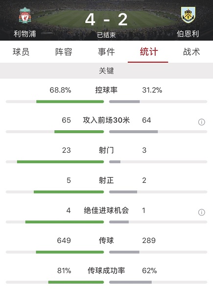 数据方面利物浦全场占据优势,不仅控球率接近7成,多达23脚的射门数更是远高于伯恩利的3脚,其中5脚射正。