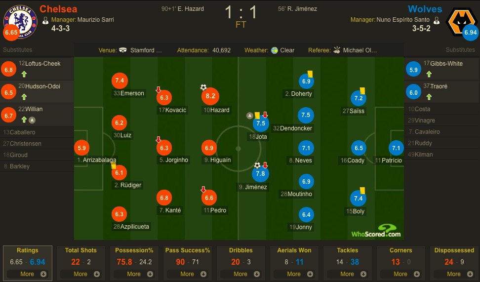大赢家3月11日讯 北京时间3月10日22:05,英超第30轮,切尔西凭借阿扎尔补时阶段的进球,主场1-1战平狼队。赛后,阿扎尔得到Whoscored8.2分的评价,为全场最佳。