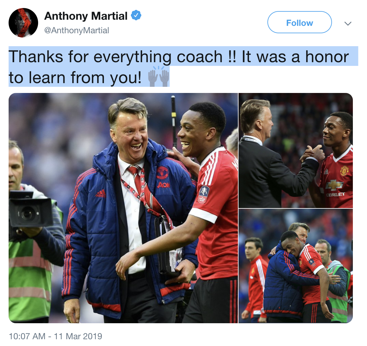 曼联前锋马夏尔发推感谢了范加尔。他写道:“教练,感谢你做的一切,很荣幸能向你学习。”