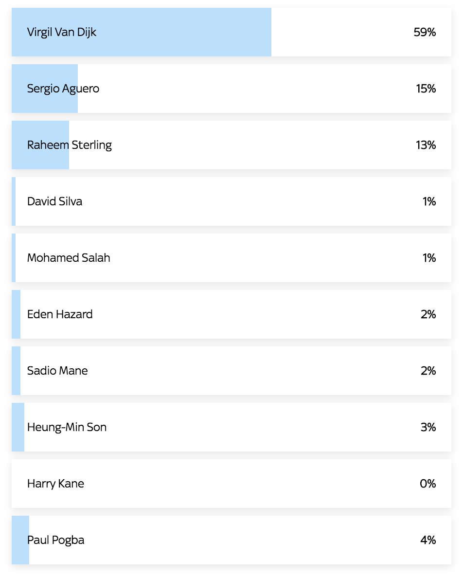球迷们的具体投票如下:范戴克59%,阿圭罗15%,斯特林13%,博格巴4%,孙兴慜3%,阿扎尔、马内2%,大卫-席尔瓦、萨拉赫1%,凯恩不足1%。