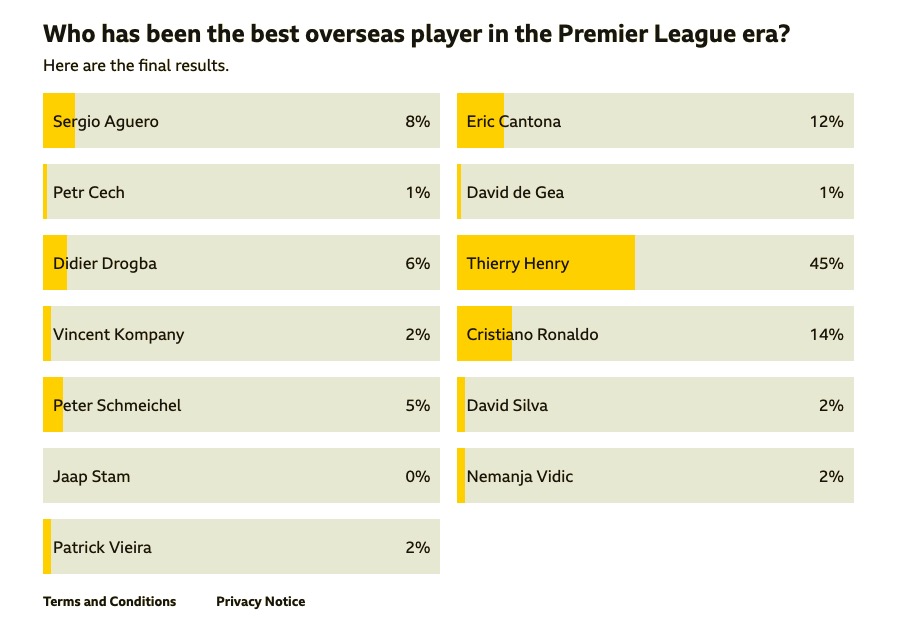 曾在曼联效力的C罗排名第二,但他的票数离亨利相距甚远。在他之后还有曼联名宿坎通纳、曼城前锋阿圭罗、切尔西名宿德罗巴和前曼联门神舒梅切尔。