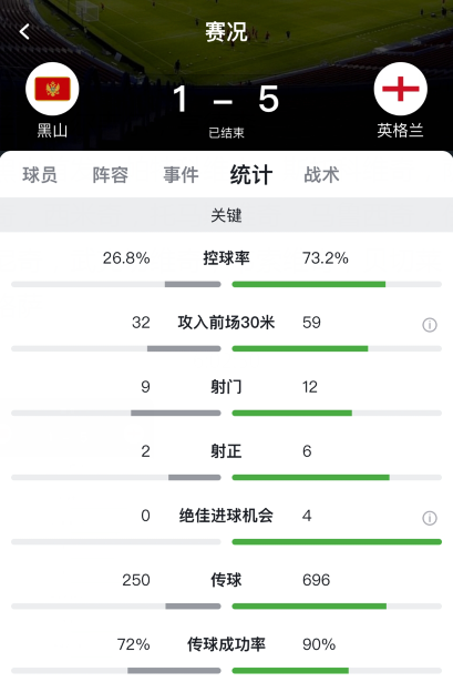 数据方面英格兰全场占据绝对优势,不仅控球率高达73.2%,12脚射门也高于黑山的7脚,其中6脚射正且传球成功率也高达90%。
