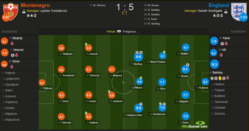 最终全场比赛结束,英格兰客场5-1大胜黑山。